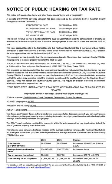 Kaufman County ESD No. 3 adopted a tax rate that will raise more taxes for Maintenance and Operations than last year's tax rate. The Tax Rate will effectively be raised by 17.20 percent and will raise taxes for Maintenance and Operations on a $100,000 home by approximately $14.68.